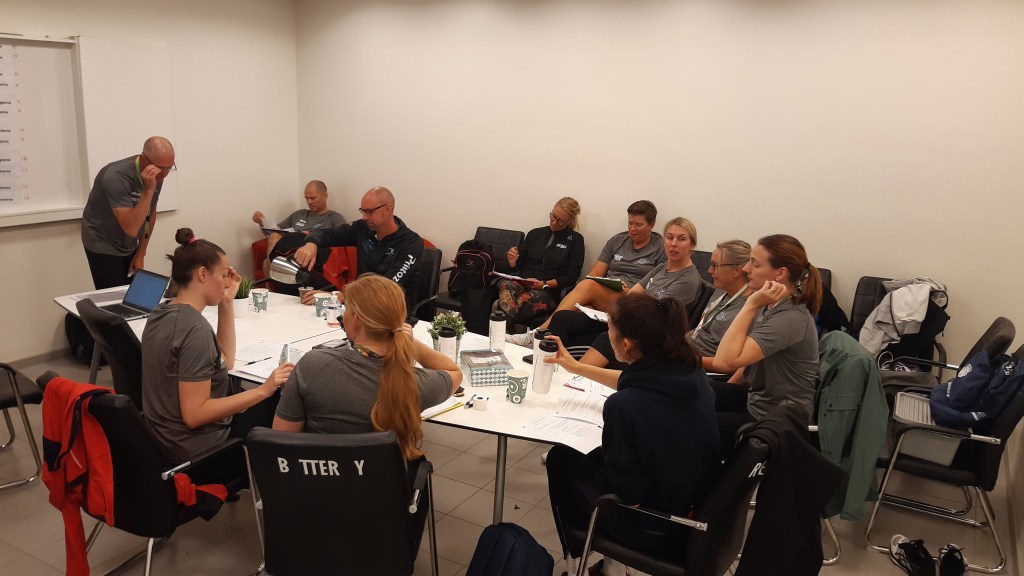 08.30 Àr det coachmöte i Coaches Lounge och BIP Instruktören gÄr igenom första trÀningen, hur det ska genomföras, vad vi vill att coacherna ska fokusera pÄ och ge feedback pÄ. MÄnga gÄnger har coacherna redan fÄtt trÀningen innan, sÄ de Àr lite förberedda!